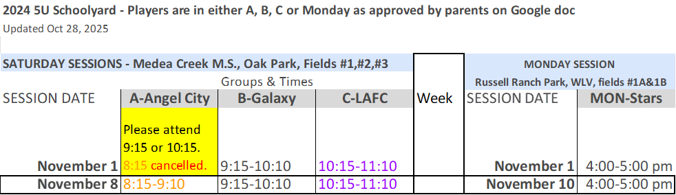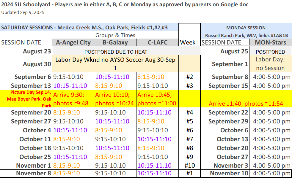 Saturdays - would start Aug 23 - Parents select a group which will have 3 start times rotating throughout the season ~8:15 am, 9:15 am, 10:15 am).