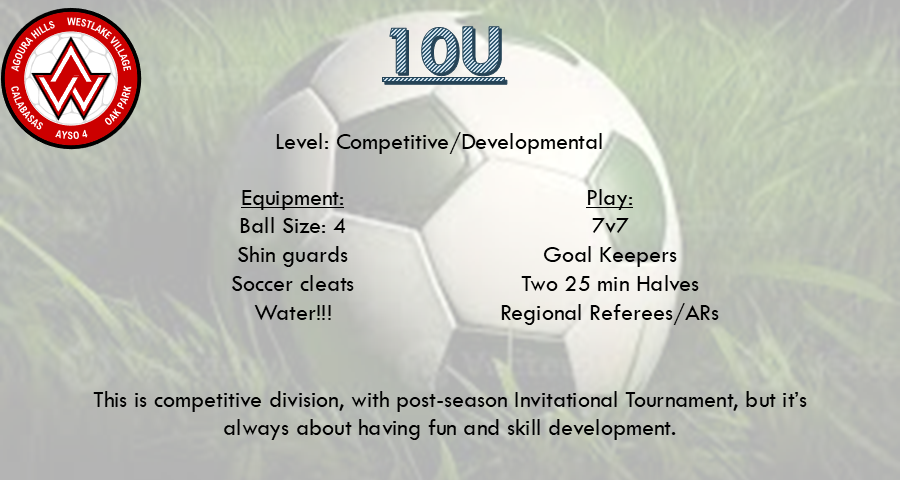 More laws of the game are enforced in 10U such as offsides, passing back to goalkeeper, fouls resulting in direct and indirect kicks, penalty kicks, and stricter enforcement on throw-Ins.